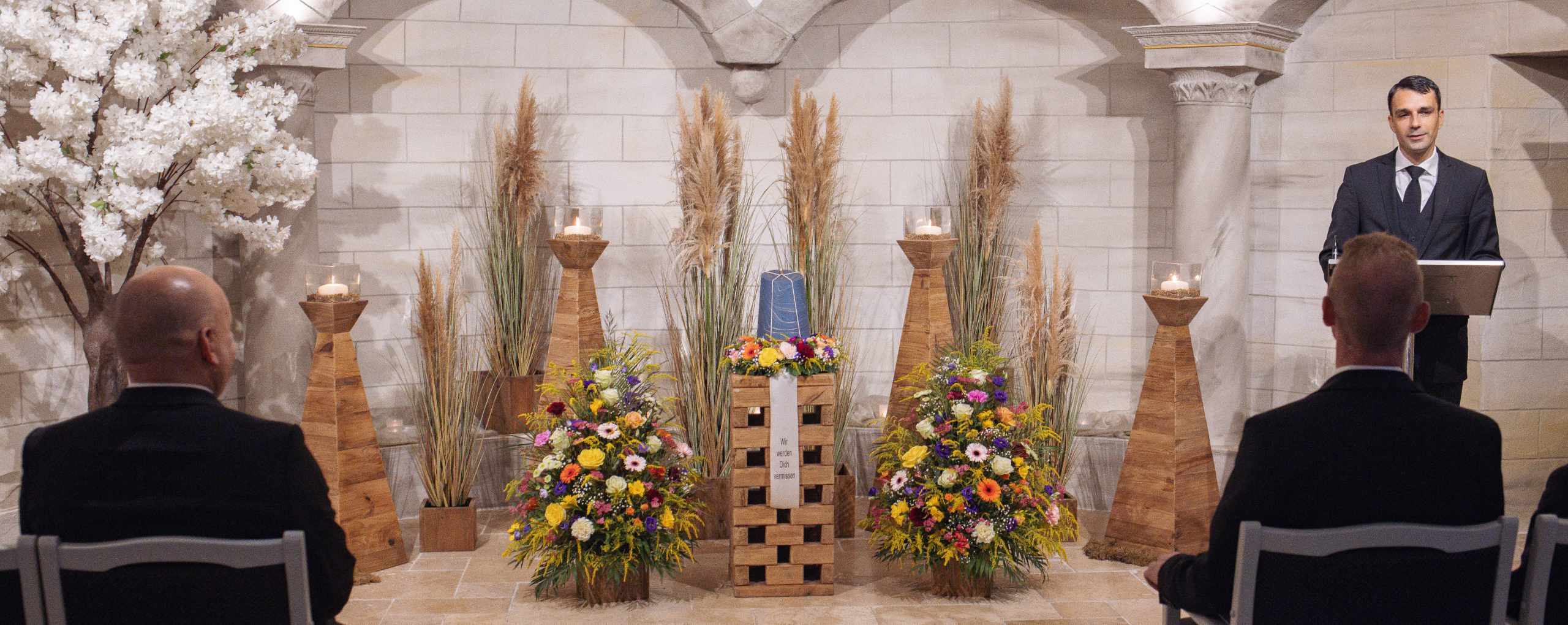 Hat der Verstorbene das Meer geliebt? War er Sportler oder Motorradfahrer? Musiker oder Maler? All das kann die Dekoration widerspiegeln. Ganz gleich, ob Wanderschuhe oder die Lieblingsplatten, ob Trompete oder Tennisschläger – wir integrieren persönliche Gegenstände gerne in die Dekoration. Und wir ergänzen sie auf Wunsch zum Beispiel um Kerzen und Leuchter, die wir zur Verfügung stellen.
